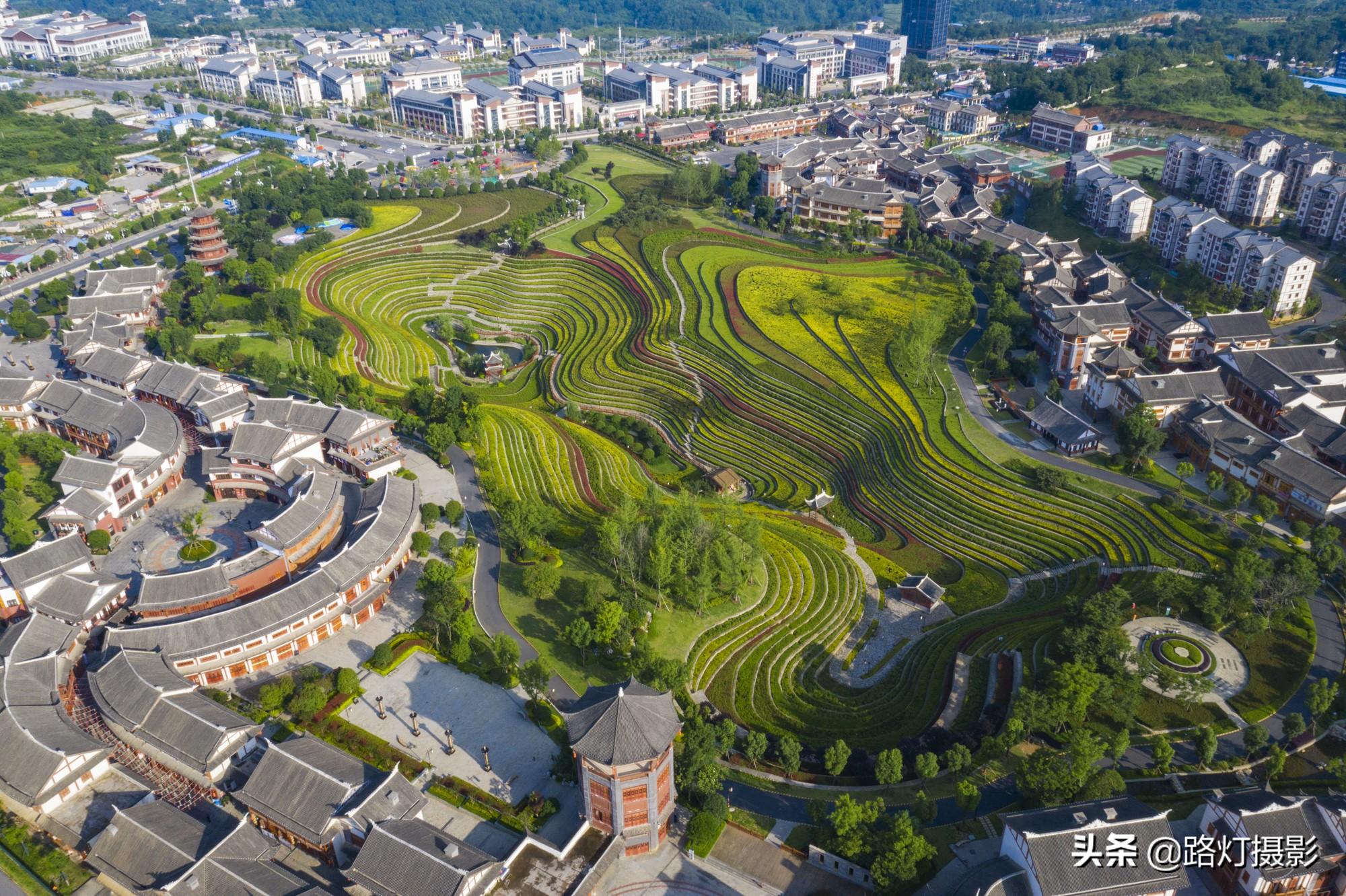 古彝梯田位于贵州省毕节市大方县的奢香古镇,这是一座人造的花海梯田,也是一座建在城市中央的花海梯田,面积有12万平方米,空中俯瞰像大地的指纹,非常漂亮。