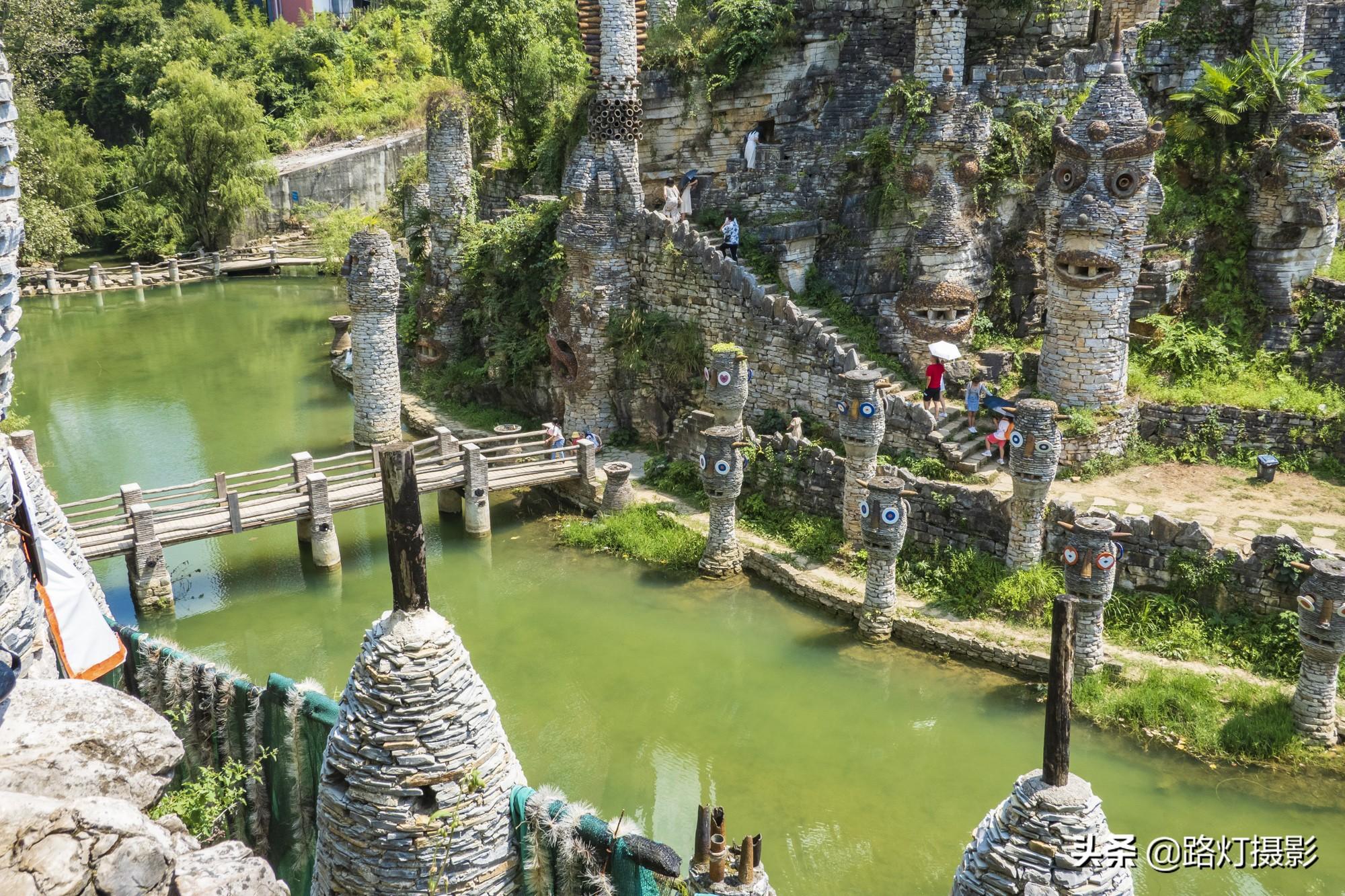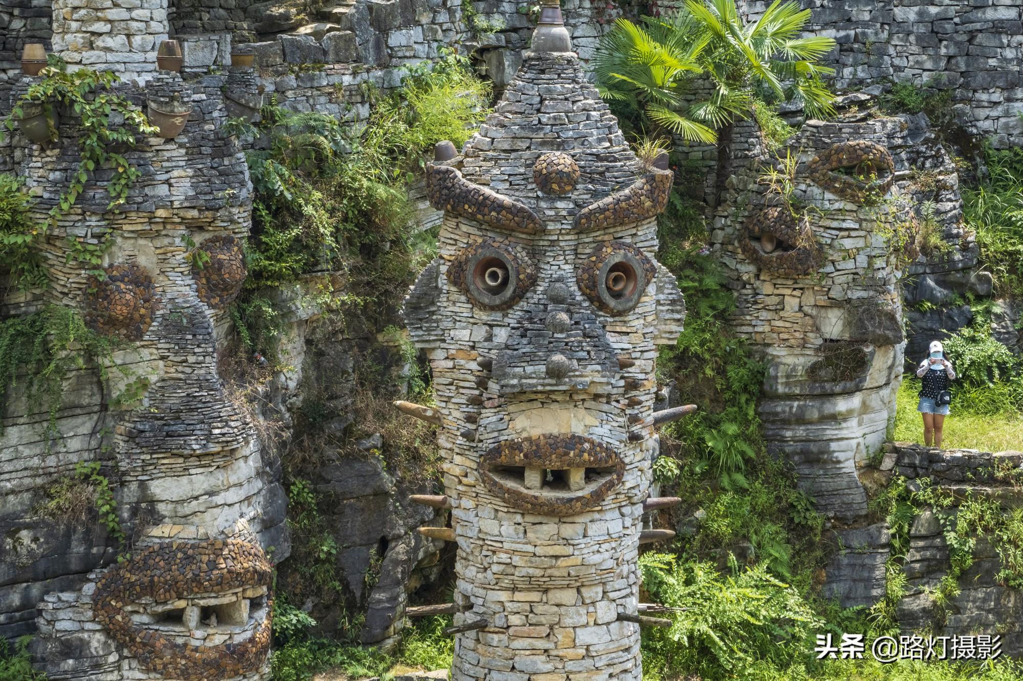 夜郎谷里到处是奇异夸张的石头人像造型,据说是根据贵州当地的傩戏面具打造的,用的材料都是石头、破陶瓷片、建筑垃圾等,废物利用,发挥自己的艺术想象力,创造了这些作品。如今,宋培伦将夜郎谷无偿捐赠给了当地的一所学校。