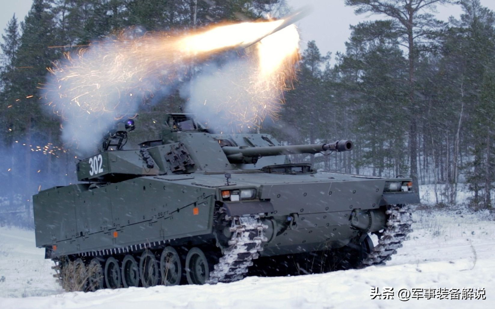 CV90步兵战车,于1993年投入使用。重22.4吨,长6.47米,最多可搭载3名乘员和8名人员。最高时速可达70公里/小时,装备有一门40毫米机炮和一挺机枪。