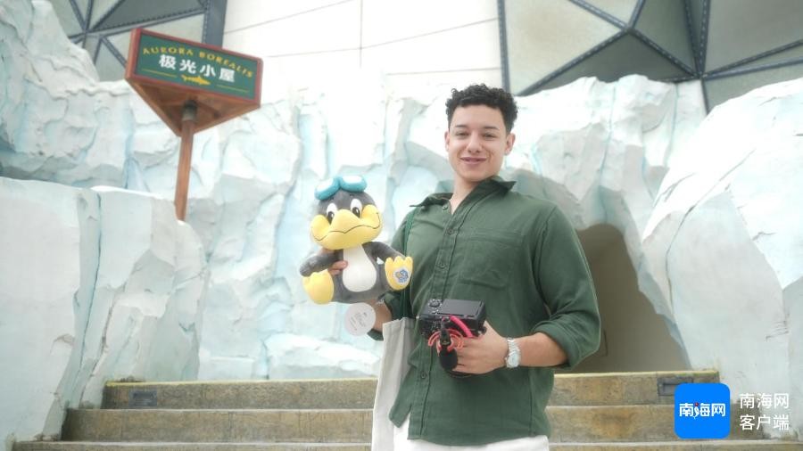 Harvey手持海洋欢乐世界特色企鹅IP伴手礼合影。海南国际传播中心供图