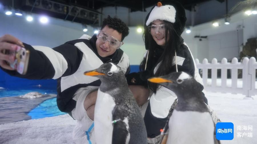 Harvey(左)和巴布雅企鹅互动拍照。海南国际传播中心供图