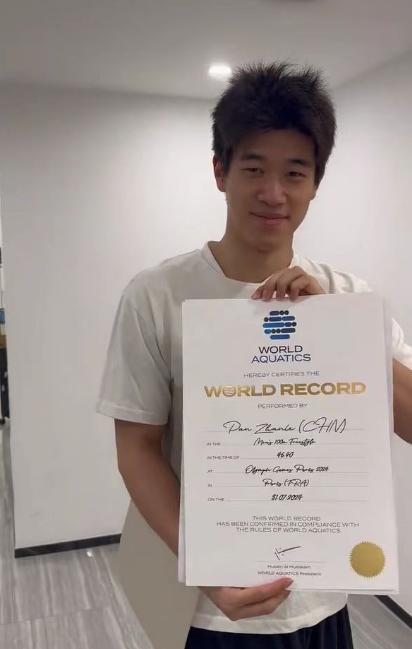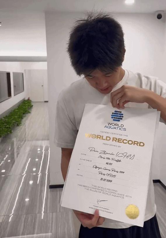 潘展乐收到世界纪录证书 “这有什么介绍的,第二个了”