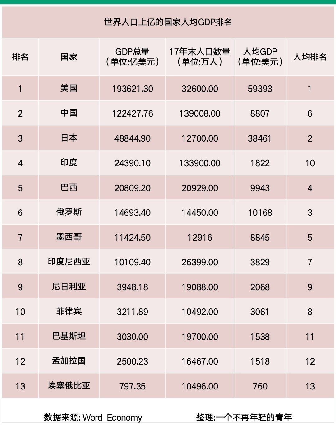 世界人口上亿的国家目前有13个,这13个国家经济总量共计45.98亿美元,以2017年人口数量46.91亿人为基数,人均GDP约9801美元。
