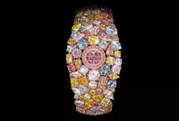 据了解,这款腕表由201克拉的钻石镶嵌而成,其中包括15克拉粉钻、12克拉蓝钻、11克拉白钻、163克拉小黄钻和白钻。874颗钻石围绕在表盘周围,构成了花团锦簇的感觉,想想都贵的吓人,它也被卖出了1.65亿元,是世界上最贵的手表!