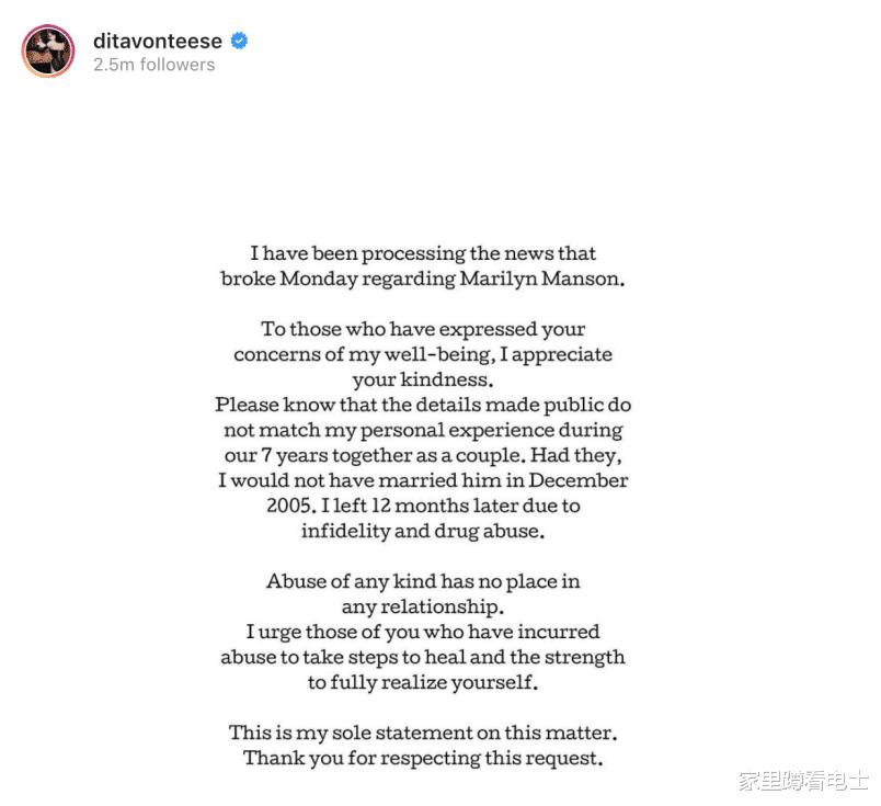 根据2月5日《yahoo》的报道,曼森前妻蒂塔·万提斯也发声了。短短7句铿锵有力,理性中透着高情商,堪称公关范文。