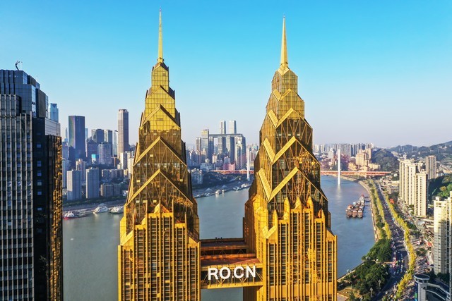还有哪些城市有已经建成的双子星摩天楼?大家补充。下面这两栋楼是重庆的,喜来登双子星,金色建筑。