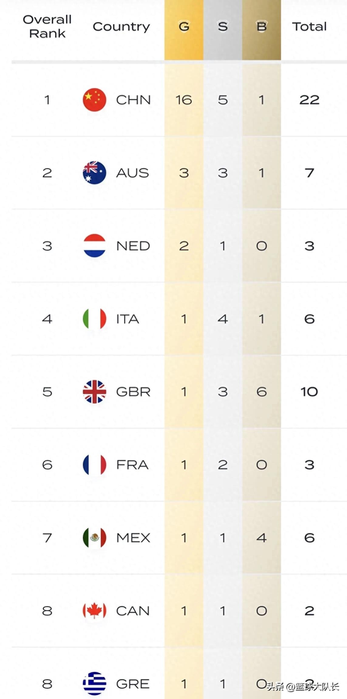 我们来看看其他代表团,奖牌榜排名第2和第3的分别是澳大利亚和荷兰,两个代表团金牌数合计仅为5枚,澳大利亚3金3银1铜,荷兰2金1银。英国代表团虽然只排名奖牌榜第5,但英国代表团奖牌数量已经突破10枚,是前2个项目结束后除中国代表团以外发挥最好的代表团。