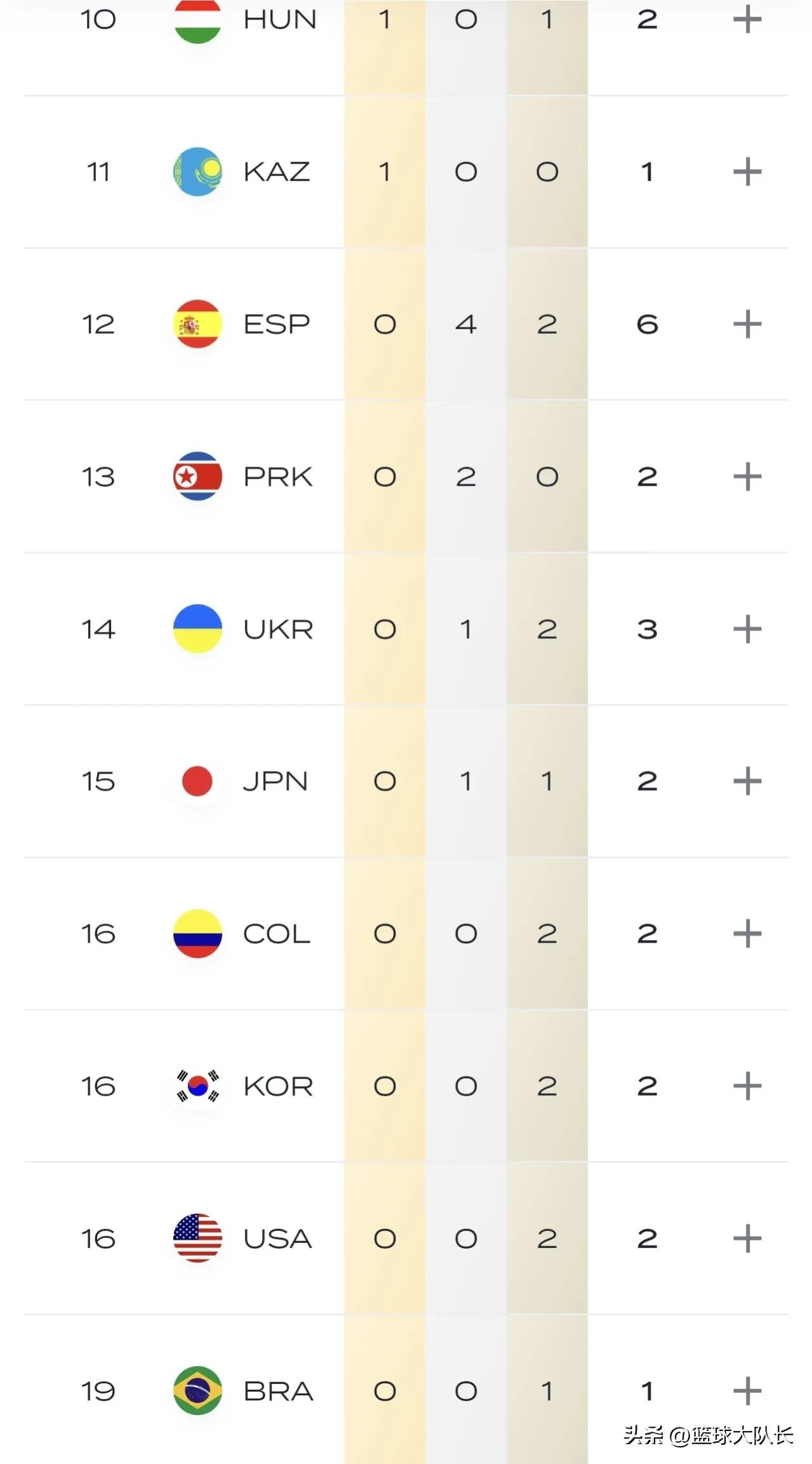 几个老对手则发挥失常,日本1金1银2铜,总奖牌数4枚排名奖牌榜第15位,韩国和美国目前战绩相同各斩获2枚铜牌,排名并列第16位。