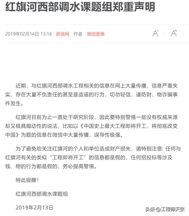 ——2018年9月,课题组首次声明:“红旗河”西部调水课题目前仍处于研究阶段,仍未进入工程设计阶段。课题组目前也不隶属于任何机构,为民间研究。