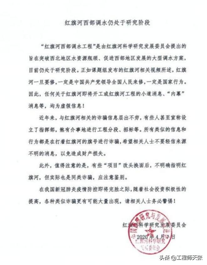 ——2020年4月7日,由中国西部研究与发展促进会红旗河科学研究发展委员会声明:红旗河西部调水工程仍处于研究阶段。任何关于红旗河即将开工或红旗河工程的小道消息、内幕消息,均为虚假信息。看到这,相信大家已经对红旗河工程的进展有了清晰的认识。