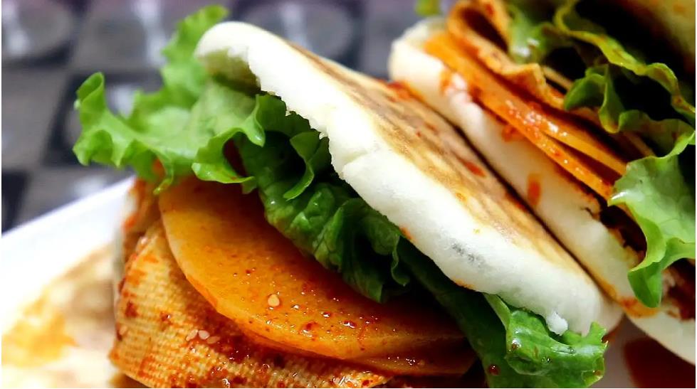 在西安的美食街上,您会看到众多排着队伍的小店,这其中一定有土豆片夹馍。土豆片夹馍的配菜有大片的土豆、方块豆腐皮、生菜。配菜简单,但浓郁秘制的酱料是人们无法拒绝的。