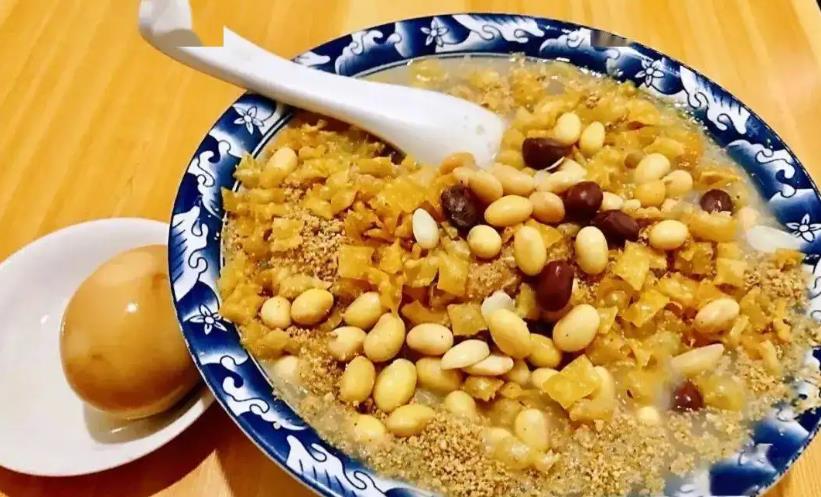 而麻花是用面食炸成的小吃,酥脆可口,营养丰富。早餐可以选择油茶和麻花搭配食用,浸满油茶汤汁的麻花虽不酥脆,却有着绵软劲道的口感,撒上炒黄豆和花生碎,的确是幸福的味道。