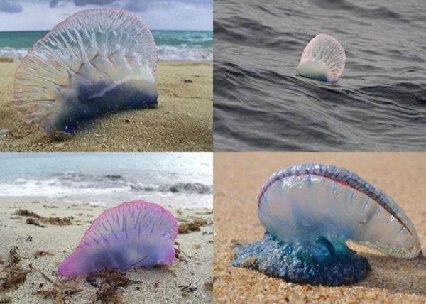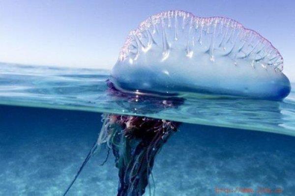 僧帽水母,也叫葡萄牙战舰水母,千万要注意,碰到这种水母还是退避三舍的好,它的浮囊上有发光的膜冠,能自行调节方向,借风像帆船似的在水面漂行。在水面上漂浮的淡蓝色透明囊状浮囊体,前端尖、后端钝圆,顶端耸起呈背峰状,形状颇似出家修行僧侣的帽子,故取名僧帽水母。不过实际上,它不能完全算是“水母”。僧帽水母所分泌的毒素属于神经毒素,随着时间的推移,毒素的作用逐渐加重,伤者除了遭受剧痛之外还会出现血压骤降,呼吸困难,神志逐渐丧失,全身休克,最后因肺循环衰竭而死亡。