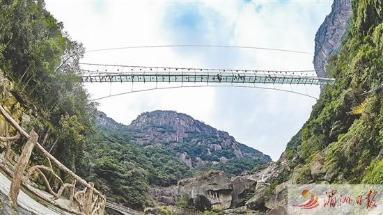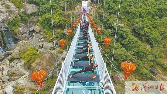 2月9日,我国首座全息7D玻璃天桥在九龙谷4A级景区落成。玻璃天桥长280米、垂直悬空约180米,将为春节旅游增添一项惊险有趣的新项目。图为投用当天,瑜伽、太极、街舞、骑行等快闪表演在高空惊险上演。记者 蔡昊 摄