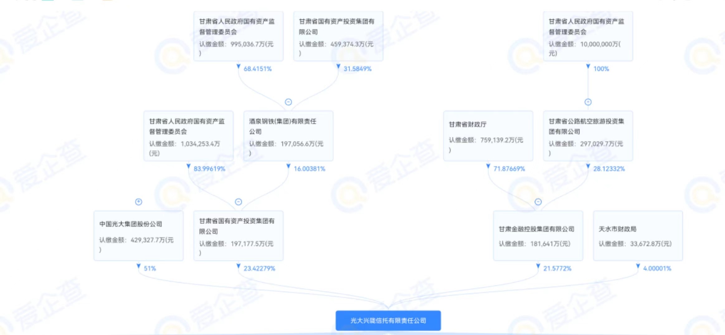 光大信托全称是光大兴陇信托有限公司。其股权结构简单,实控人中国光大集团持股51%。股权穿透后剩余股份由甘肃省政府持有。光大集团是金融行业内少有的全牌照金融机构,旗下光大银行、光大永明人寿、光大证券、光大信托是为光大集团的四大金融板块。