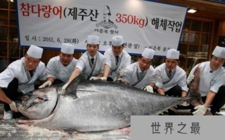 【巨型金枪鱼现身首尔】韩国首尔一家饭店的厨师们在展示巨型金枪鱼。当日,一条打捞自济州附近海域的巨型金枪鱼被运送到首尔,成为饭店一景。这条金枪鱼重达350公斤,长达2.7米。
