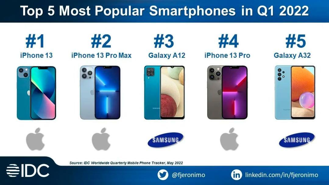 在近日,IDC 发布了最新的智能手机市场报告,列出了 2022 年第一季度全球最畅销的智能手机排名。