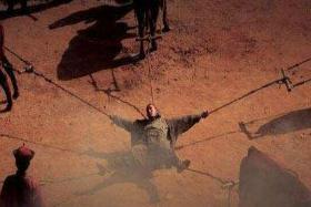车裂即五马分尸,是中国古代刑罚中十分残暴的一种,就是把受刑人的头跟四肢套上绳子,由五匹快马拉着向五个方向急奔,把人撕成六块。记得商鞅就是受五马分尸之刑。要把人的头跟四肢砍下来都得花不少力气,更何况是用拉扯的。而受刑人身受的苦处更可想而知,真到撕开的时候,恐怕受刑人已经不会觉得痛苦了,痛苦的是正在拉扯的时候。