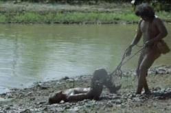 狂吠不止的猎狗一个个冲了上去,可是力大无比的野人抓起一只猎狗劈腿就撕,随着猎狗的一声声惨叫,11只猎狗均被撕成两半,猎人们扣动了扳机,一大股殷红的鲜血从雌性野人的大腿处冒了出来,“扑通”,雌性野人跪倒在地上,随即而来的众猎人一齐围上,将野人捆了个结实。