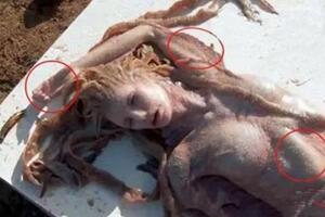 一队建筑工人,在索契城外的黑海岸边附近的一个放置宝物的坟墓里,发现了这一难以相信的生物。这一发现的消息是由苏联考古学家耶里米亚博士在最近透露给西方的。她看起来像一个美丽的黑皮肤公主,下面有一条鱼尾巴。这一惊人的生物从头顶到带鳞的尾巴,计长有173厘米。科学家相信她死时有100多岁的年龄。