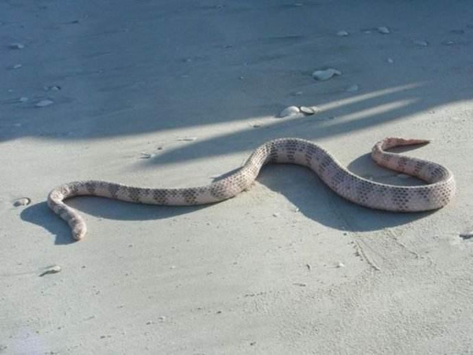 3、橄榄海蛇 橄榄海蛇是一个危险的毒蛇,是澳大利亚北部的珊瑚礁蛇。它有一个坚固的身体,紫褐色与淡棕色的底部。通常有一些全身乳白散鳞,尾部垂直压缩,大多是用奶油下来后布朗里奇白色。平均大小为1.2米,但能长到2米。虽然它看起来非常凶悍极具攻击性,但是它的攻击是罕见的。