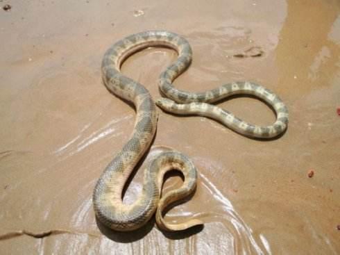 印澳海蛇,体长为120—200厘米,尾部扁平,身体主要为浅褐色或黄色,有深色斑块和斑纹,侧面有斑点。分布于澳大利亚西北部和新几内亚南部之间的海域。栖息于浅海地带,海湾和有潮河等地,主要以鳗鲡等鱼类为食,卵胎生。