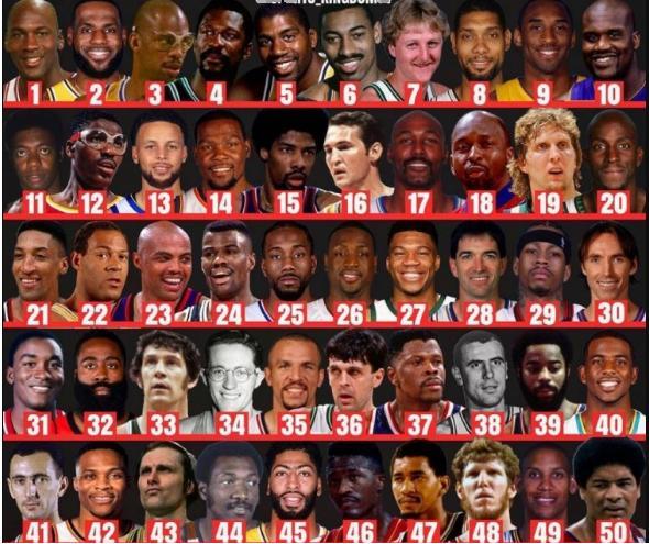 NBA历史一共70多年,这其中诞生了很多超级巨星,但同时这些超级巨星的排名也有较大出入。特别是每年季后赛夺冠的球星的历史地位肯定不一样,有点球星一冠封神,因为夺冠而大幅提升历史地位。美媒重新排名NBA历史前50大巨星,詹姆斯第二名,库里力压杜兰特,哈登威少保罗齐齐上榜,现役联盟这些球星他们都排名第几呢?(美媒榜单截图在最后一张,为了方便球迷清楚头像和排名,文章详细列出排名序列)