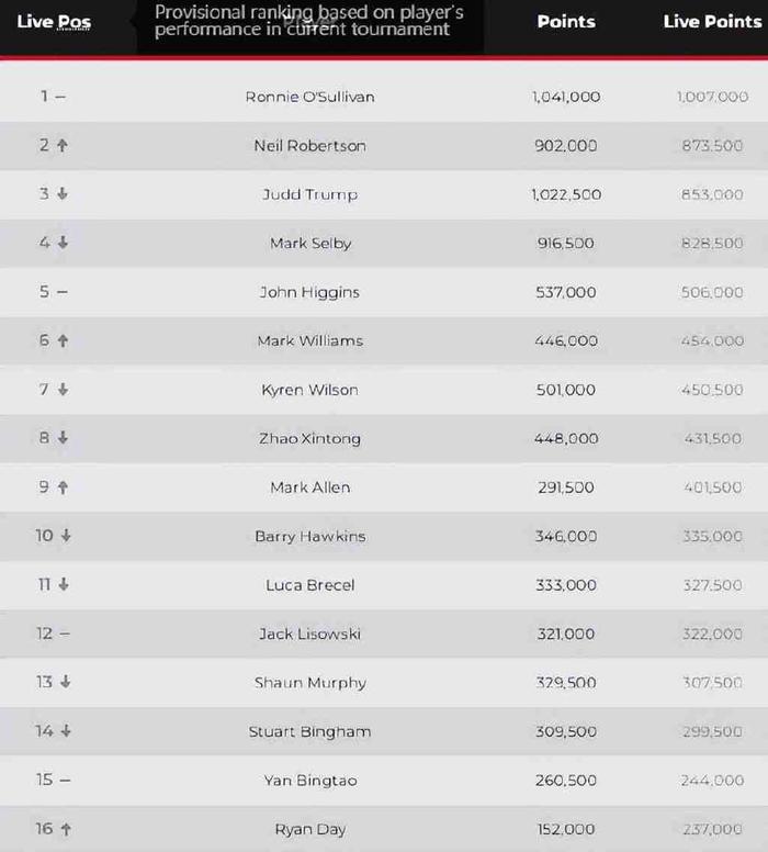 奥沙利文仍然排名世界第1,尼尔·罗伯逊反超特鲁姆普,升至第2位,特鲁姆普跌至第3,马克·塞尔比排名第4。第5到第16位依次是希金斯、马克·威廉姆斯、凯伦·威尔逊、赵心童、马克·艾伦、巴里·霍金斯、卢卡·布雷切尔、利索夫斯基、肖恩·墨菲、宾汉姆、颜丙涛、瑞恩·戴。