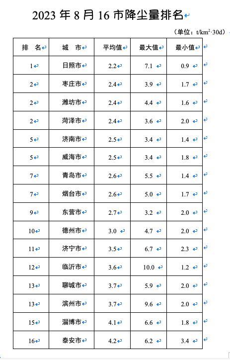 2023年8月,16市降尘量在2.2~4.2t/km2·30d之间,平均为3.0t/km2·30d,日照市、枣庄市、潍坊市、菏泽市(并列)降尘量较小,泰安市、淄博市、聊城市、滨州市(并列)降尘量较大。