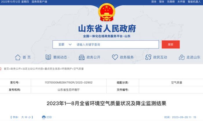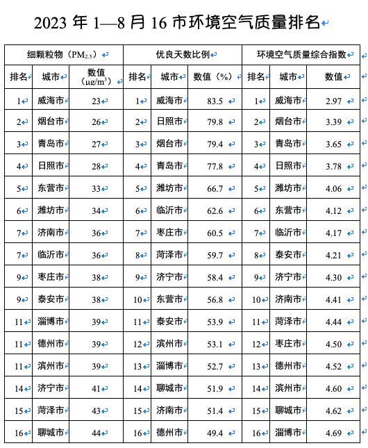 1-8月,泰安市优良天数比例为53.9%,环境空气质量综合指数4.21,排名第8。