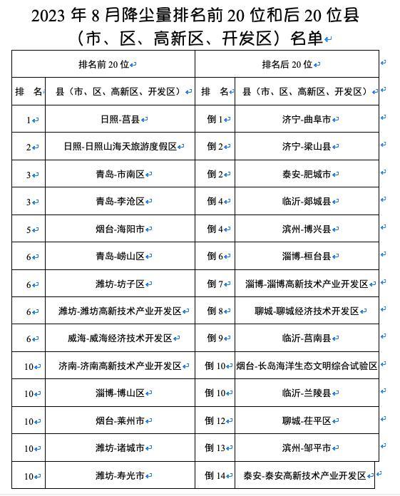 在8月份16市降尘量排名中,泰安排名垫底。其中,在降尘量排名后20位县(市、区、高新区、开发区)名单中,肥城市、泰安高新技术产业开发区上榜。