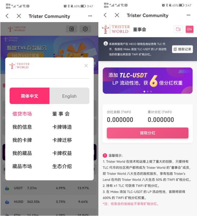 如持有HECO链上的TLC时,可以获得Trister Community DAOs孵化项目Trister 借贷平台50%TWFI矿税分红。登录Trister's Lend的Dapp官网【https://www.trister.pro/】-董事会页面进行Claim领取TWFI代币分红。每天都可以领取!!