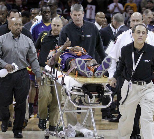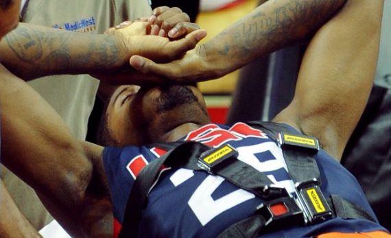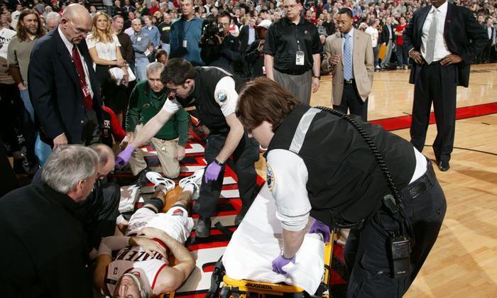 图中这名球员叫费尔南德斯,是西班牙的球员,当时效力于开拓者队。2009年3月份开拓者对阵湖人的一场比赛,第三节费尔南德斯发动快攻准备扣篮,被追防的阿里扎打到头部,费尔南德斯在空中失去平衡,重重砸在地板上,此后便躺在地板上,为此双方还发生了大规模冲突。随后,费尔南德斯被医护人员抬出场,好在没有大碍,赛后阿里扎也做出了道歉。
