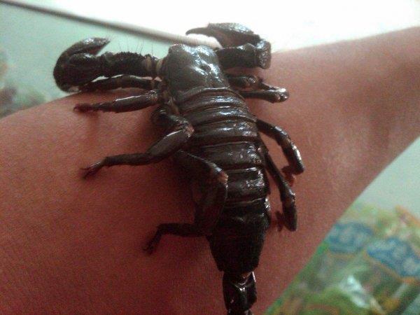 帝王蝎,原产地在非洲西部和中部开放的稀树草原和热带丛林里,不仅是世界上极限体型最大的蝎子之一(另一种巨蝎是印度斯氏异蝎Heterometrus Swammerdami,国内玩家俗称印度红爪雨林蝎),一般的成年帝王蝎体长都在0.2 — 0.3米之间,目前发现的最大的记录是0.4米,知道0.4米是个什么概念吗?成年男子的手一般长0.2米,那么世界上最大的蝎子就是你两个的首场,这要是人碰到了,估计要大战一场吧。
