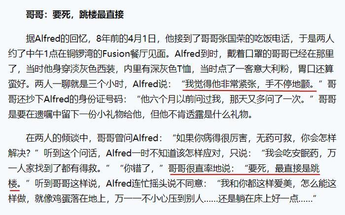 而另外一边,结合2011年室内设计师莫华炳在采访时回忆,两人曾在当天约了午餐,当时,张国荣手不停的颤抖,情绪一直不好。