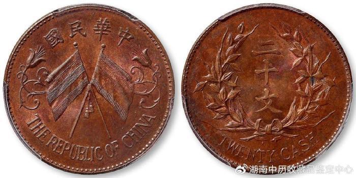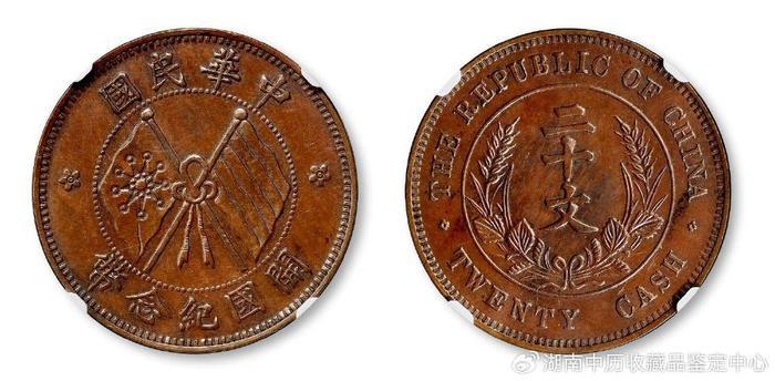 中华民国开国纪念二十文铜币样币 98.9万成交……。