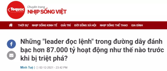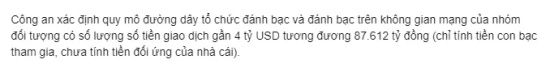 警方确定,该在线赌博团伙规模极大,交易金额近40亿美元,折合876120亿越南盾(这笔资金还只是赌徒们的赌资,不包括头目们的奖励、互惠金)。