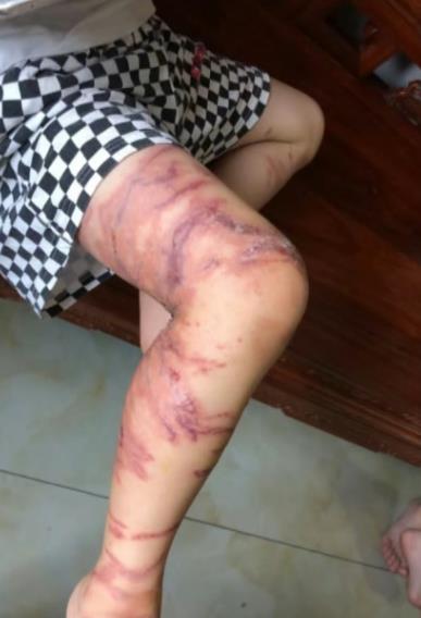 深圳市儿童医院骨科烧伤整形组主治医师 曾帅丹:过来的时候看到他的双下肢有一个个条形伞状伤痕,可以看到深度不等有些比较浅有些比较深,最深已经可以看到皮下那些脂肪组织了,说明已经达到了三度的创面,这个情况是比较严重的。