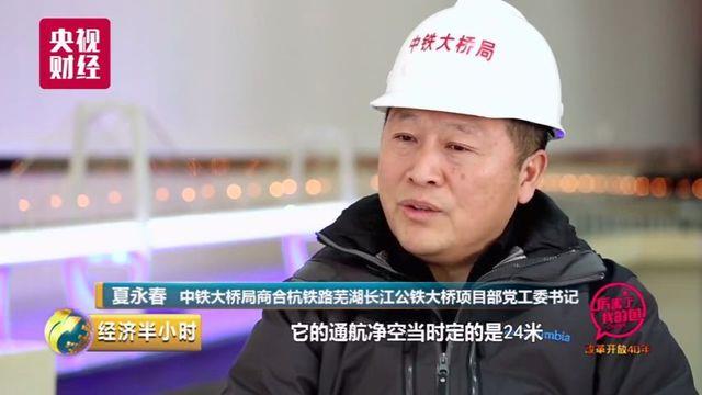 中铁大桥局商合杭铁路芜湖长江公铁大桥项目部党工委书记 夏永春:南京大桥武汉大桥的通航净空,当时定的是24米,能够通过的吨位大概就5千吨的水平。
