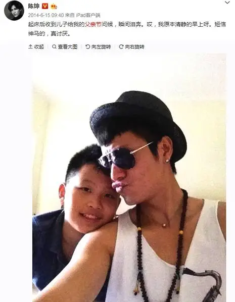 陈坤鲜少公开提及自己的儿子,只有在父亲节时会晒出自己作为老父亲的骄傲。
