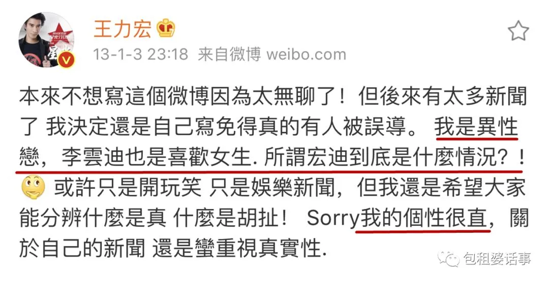 就在绯闻愈演愈烈之时,王力宏发表了直男宣言。