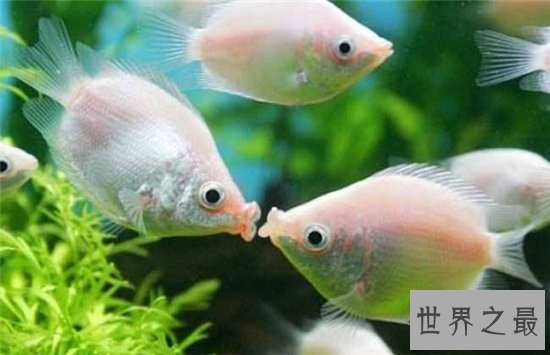 接吻鱼非常有意思,它们喜欢两条鱼相互接吻,不少情侣也是因为这个原因而购买它,代表着自己的爱情长长久久,其实它们是在水里斗争而接吻。在它们的身体上,会散发出金属光的乳白色,自由穿梭在海藻中的时候非常绚丽,更是非常好看。
