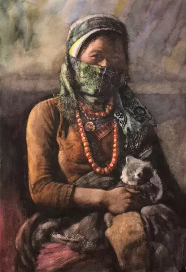 《藏女与猫》纸本水彩 53x73cm 2017年