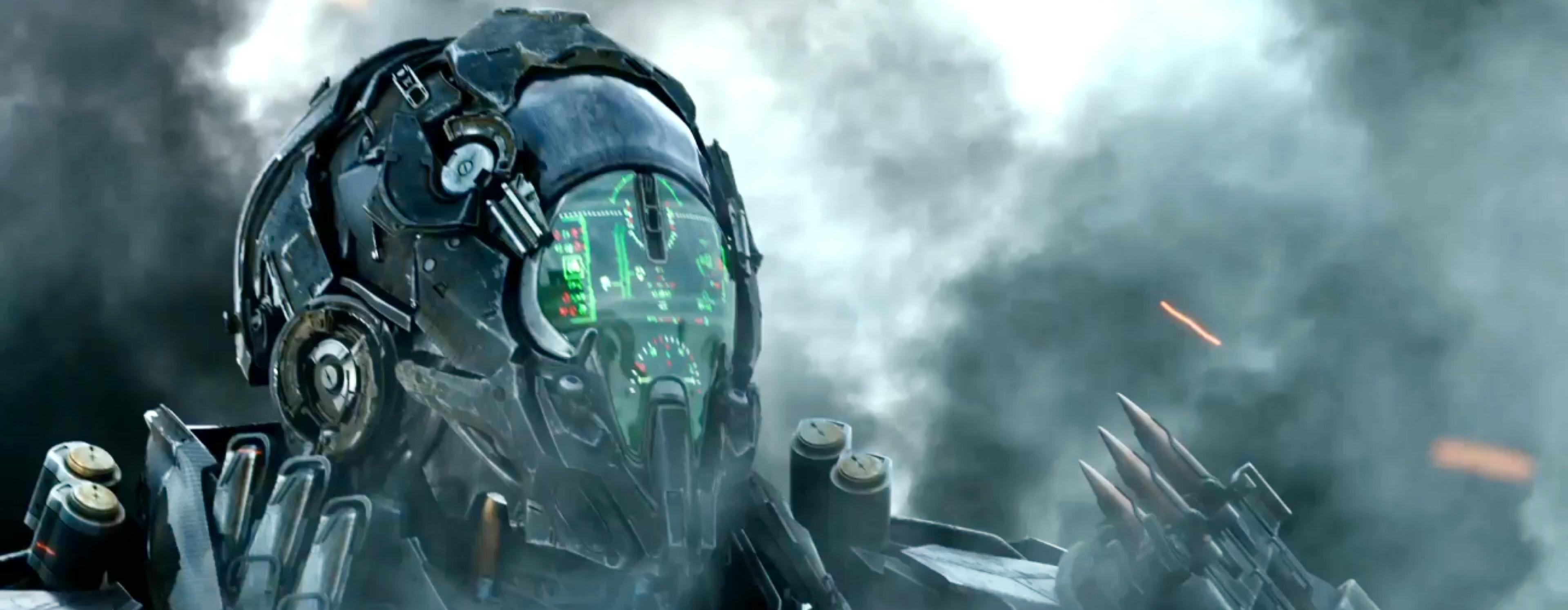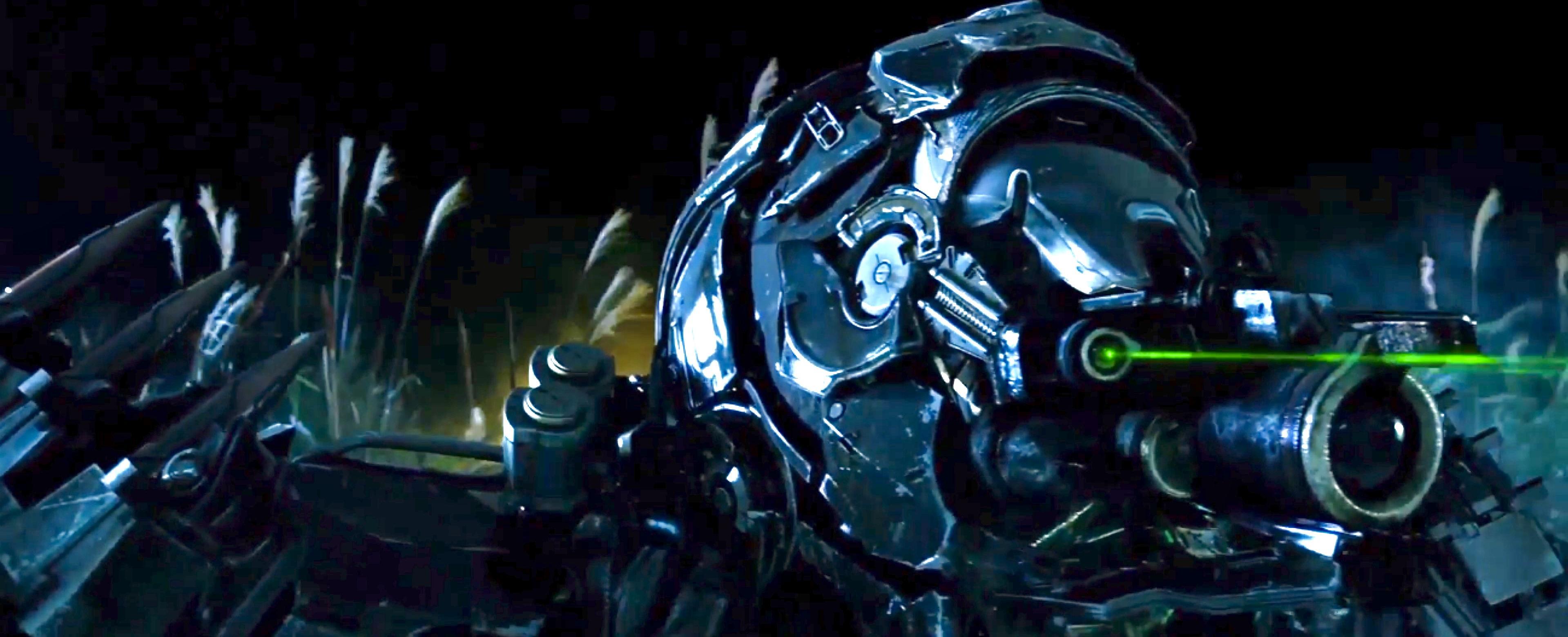 当需要使用的时候,脸部完成基本变形,可以看到升上来的淡绿色透明面罩,这一形态的主要功能是负责远程扫描,分清楚前方的基本情况,能够扫描到全景,协助肩部穿甲弹识别标进行初步定位。