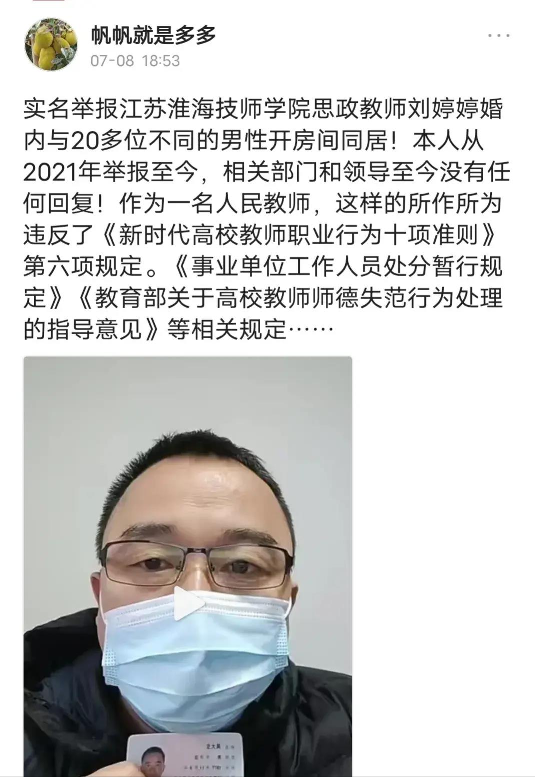 在最近的时候,有一位男性在江苏实名举报了他妻子的婚内出轨行为。根据他的叙述,他的妻子是一位名叫刘某某的思政老师,她就职于淮海技师学院,居住地在江苏东海。