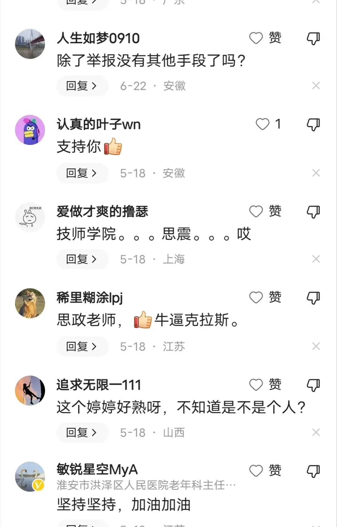 对于他的举报信息,众人意见不一。有人表示这样的行为实在太令人震惊了,作为一名教师,怎么能够在婚姻中出轨呢?而且还跟那么多人保持了不正当的关系。因此,有人支持他继续举报,以期为自己讨回公道。作为一名思政老师,如果男子所说的属实,那就太不应该了。教师享有人们和社会的尊敬,这个职业也是非常神圣的,不能因为个别害群之马的行为而败坏整个教师群体的声誉。教师也不能辜负学生和家长的期望,不能在讲台上义正言辞地教导学生,而私底下却做着道貌岸然的事情!
