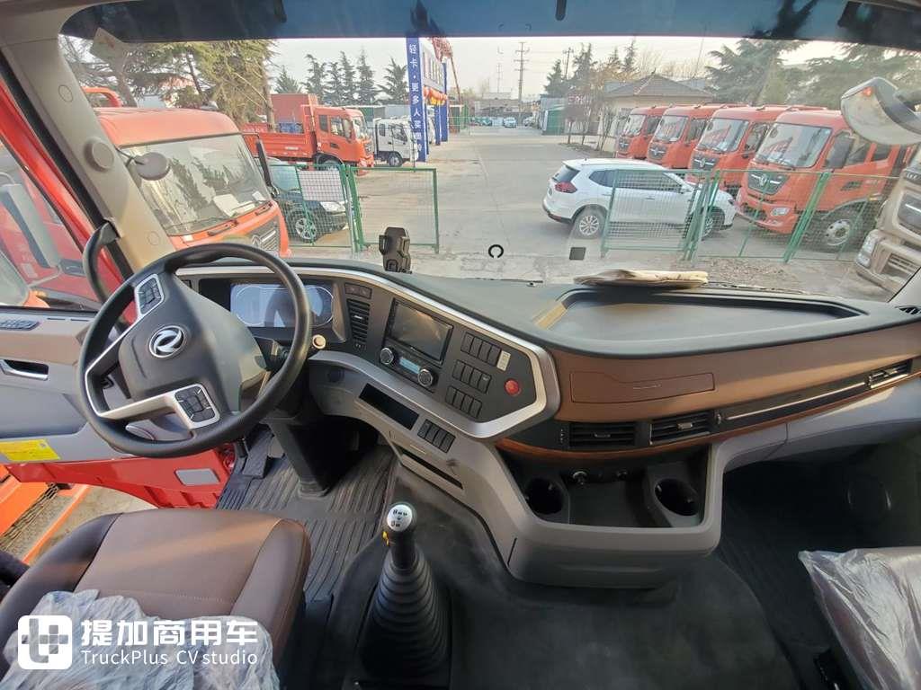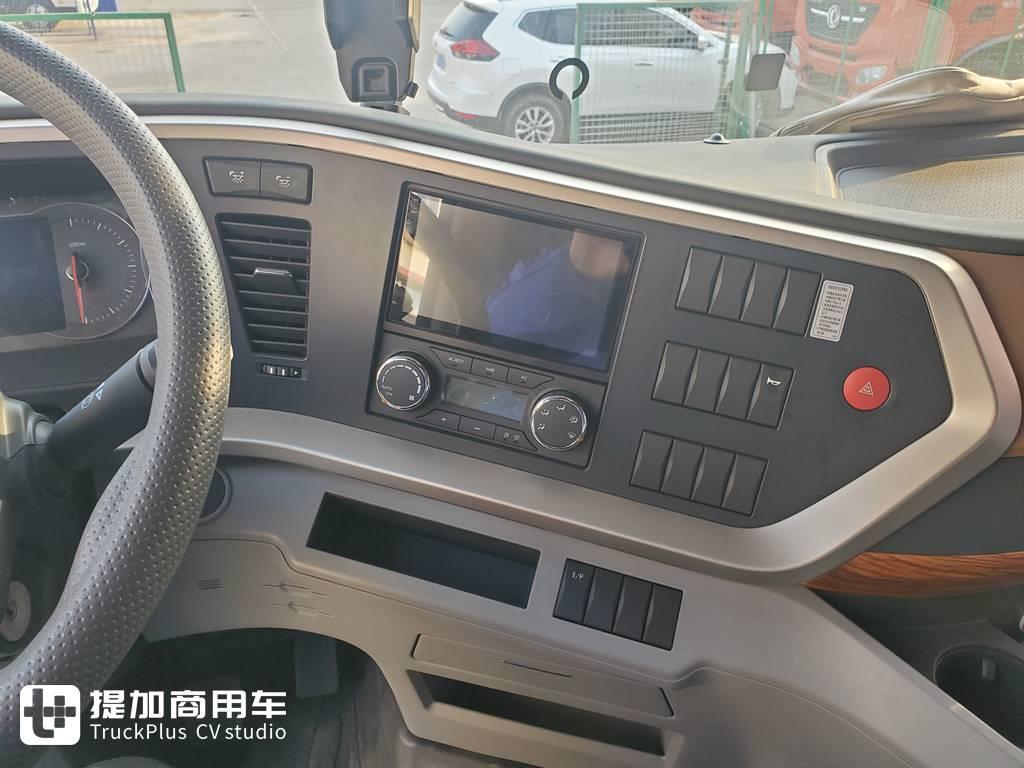 内饰上基本和老天龙没啥区别,整体就是环湾式的仪表台,上面带有银色镶边石条,工作台采用黑棕两色双拼的配色搭配,质感与做工都偏向豪华乘用车。