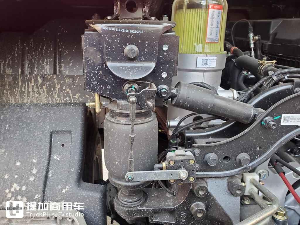 四点式悬浮的驾驶室都有配备,但是天龙旗舰上的却有着不同之处,它的后两点气囊悬浮机构在常规的竖向减震同时,还加装有阻尼杆,以消除驾驶室横向振动,确保这样高重心的驾驶室不会乱晃。