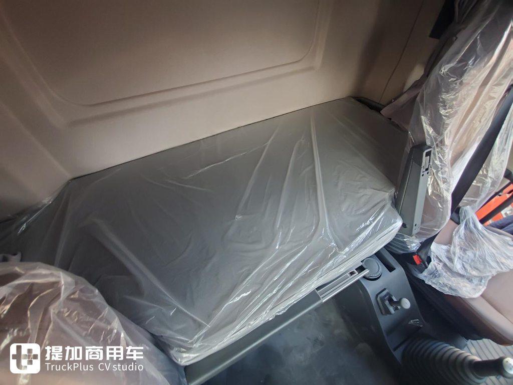 这辆旗舰王者版上使用的座椅是由伊思灵华泰供应的875NTS型气囊减震座椅,这一款座椅是目前伊思灵配套在国内重卡中的旗舰级产品。它带有十余项功能和调节模式,通风、加热、腰托、肩托等功能一应俱全,座椅表面采用打孔真皮包裹,配置一体可调节的三点式安全带。其坐垫可以进行抽拉,最长可达到54cm,并且在座椅两侧均配有无极调节臂托,非常符合人体工程学,即便是长途驾车也不会太过疲劳。