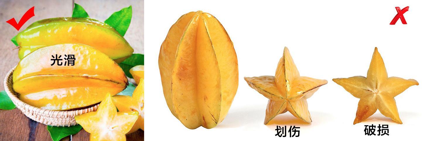 杨桃在运输贩卖的过程中,难免会表面受到一些磨损、划伤,我们在选的时候一定要慎重再慎重,不能选带有外伤的杨桃,这类杨桃很容易氧化腐坏变质。
